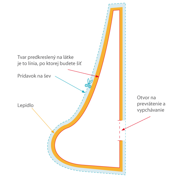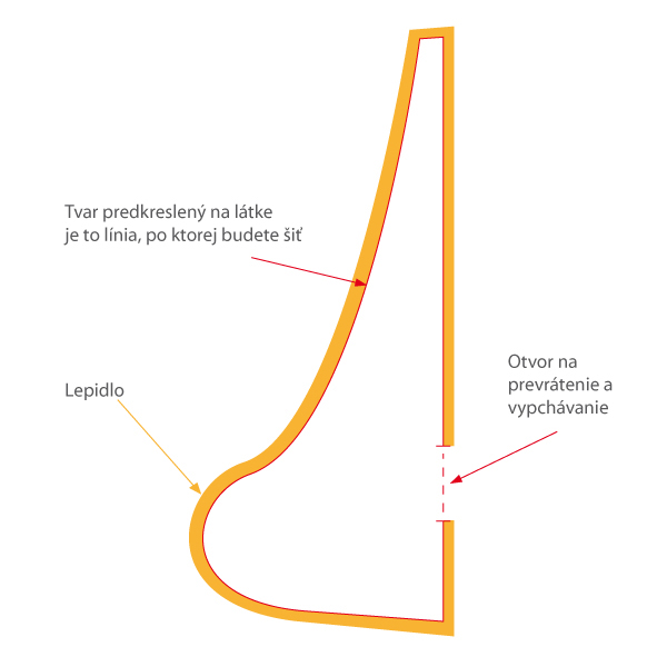 Pozdĺž tejto línie budete teraz šiť – okrem miesta vhodne umiestneného na záverečné prevrátenie celého tvaru (prípadne aj jeho vypchávanie výplňou), ktoré necháte zatiaľ neprešité.