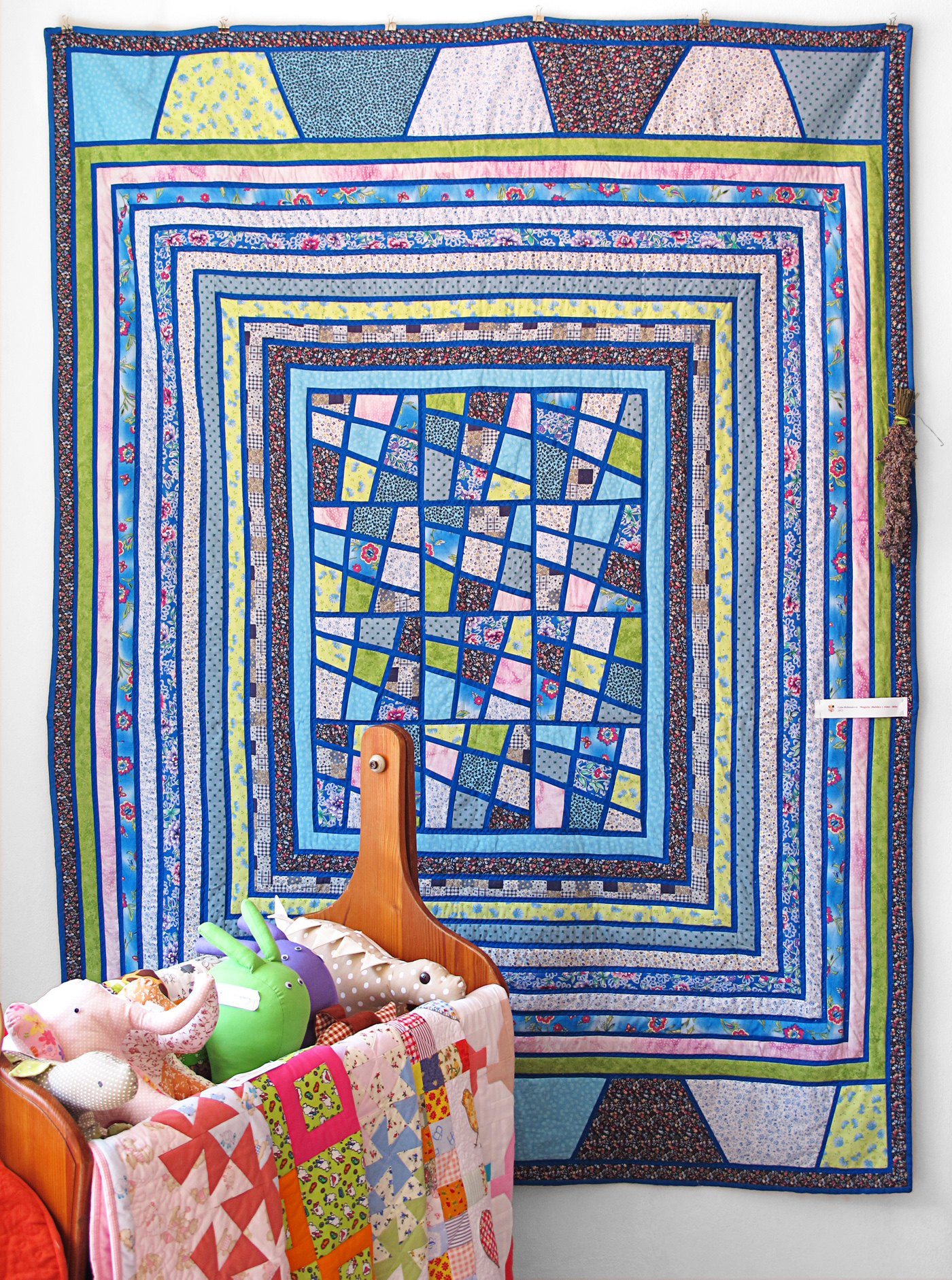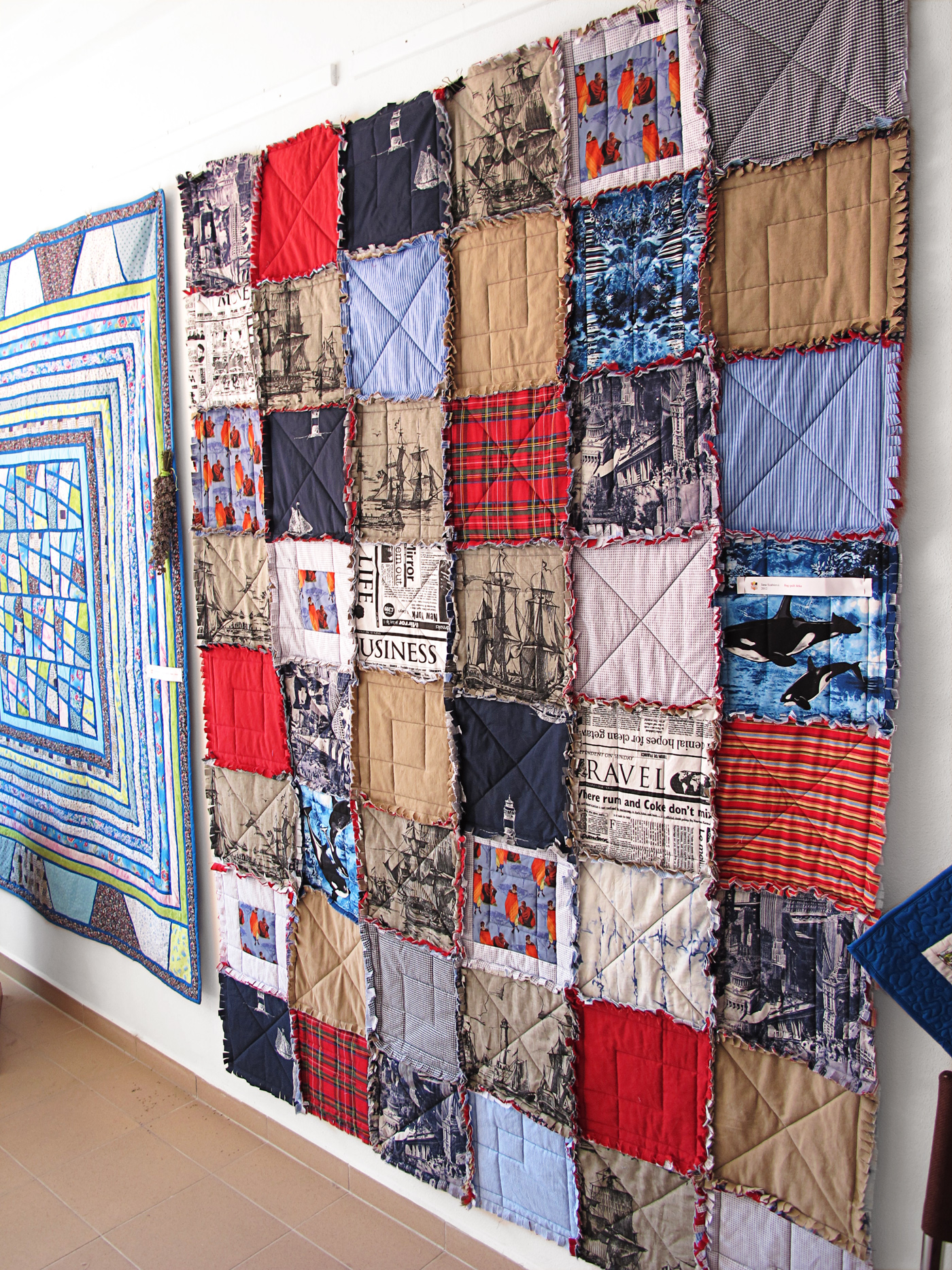 Rag quilt od Janky Szabóovej a v pozadí Magické dlaždice od Ľubky Rebendovej.