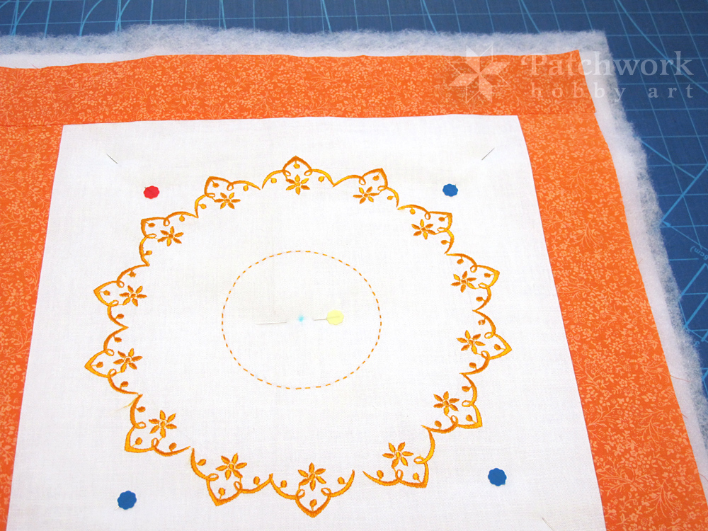 Hotový top som podložila vatelínom a bielym plátnom, spojila špendlíkmi a pripravila si tzv. sendvič na quiltovanie.