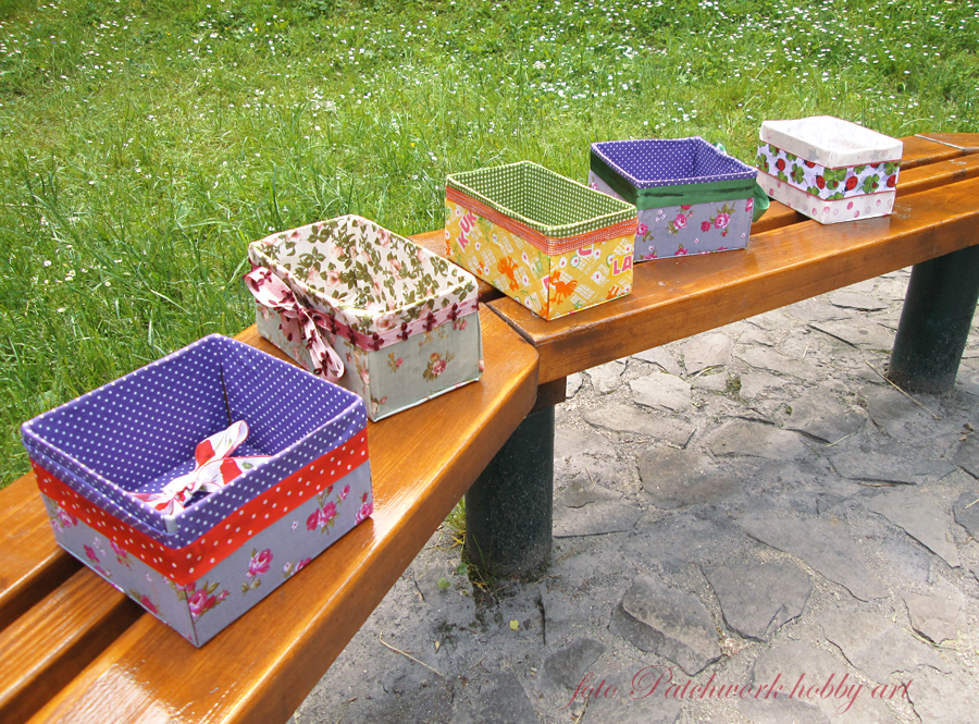 Okrem šitia spomienkových diek sme sa venovali (okrem iných tvorivých aktivít) aj dekoračným boxom – škatuľkám oblepovaným látkami.